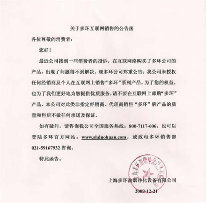 關于上海多環油煙機互聯網銷售的公告函