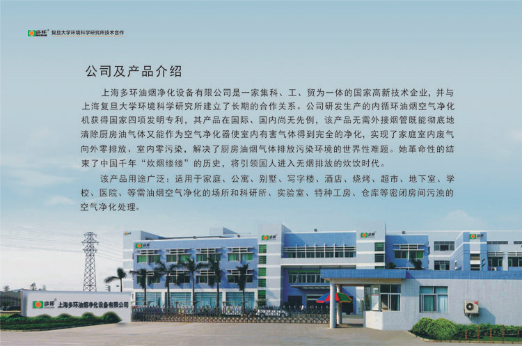 無煙管內循環吸油煙機是采用高科技手段將廚房及烹飪場所產生的油煙及有害氣體在室內進行凈化處理的一種電器設備。目前國內、國際尚無該種設備的先例。上海多環油煙凈化設備有限公司科研團隊從解決社會大氣污染及凈化家庭室內空氣出發經過多年的研究和實驗開發生產出了一種適合國人烹飪需要的內循環式油煙凈化機,它的主要特點是采用吸排凈化一體機的形式將烹飪產生的油脂、煙顆粒物及有害氣體(醛、苯、VOC等)、異味(辣、臭、酸味等)和有害細菌在室內進行凈化處理,實現了廚房油煙向室外不排放,室內室外無污染,解決了廚房油煙氣體排放污染環境的世界性難題。本公司研發生產的無管式油煙凈化機是不用煙管對外排放的油煙凈化設備,采用吸排凈化一體機的形式將烹飪產生的油脂、煙顆粒物及有害氣體(醛、苯、VOC等)、異味(辣、臭、酸味等)和有害細菌在室內進行凈化處理的廚電產品。
